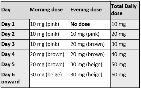 4 × 10 mg tablets, 4 × 20 mg tablets and 19 × 30 mg tablets (AUST R 220424)