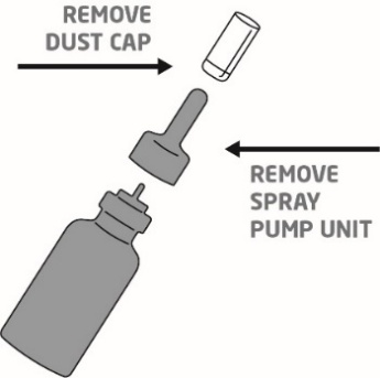 1. Remove the clear dust cap. Gently grip the sides of the white plastic spray tip and pull upwards to lift the plastic spray away from the glass bottle.